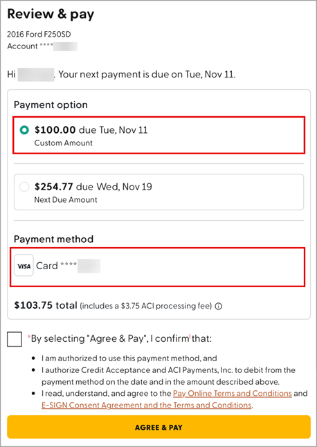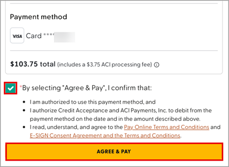 Review all payment options and fees here: How to Make Your Credit Acceptance Payment.