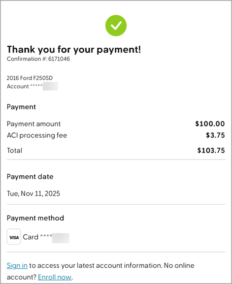 * ACI charges a processing fee based on payment amount. This will appear as a separate transaction on your bank statement.