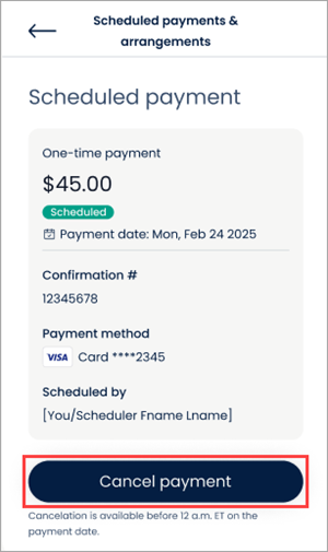 Note: Updating the saved payment method in a one-time payment does not automatically update the payment method for any future scheduled payment.