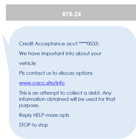 - The messages customers may receive include relevant account information and updates, standard monthly payment reminders, payment promise reminders, AutoPay payment reminders, and requests to call Credit Acceptance.